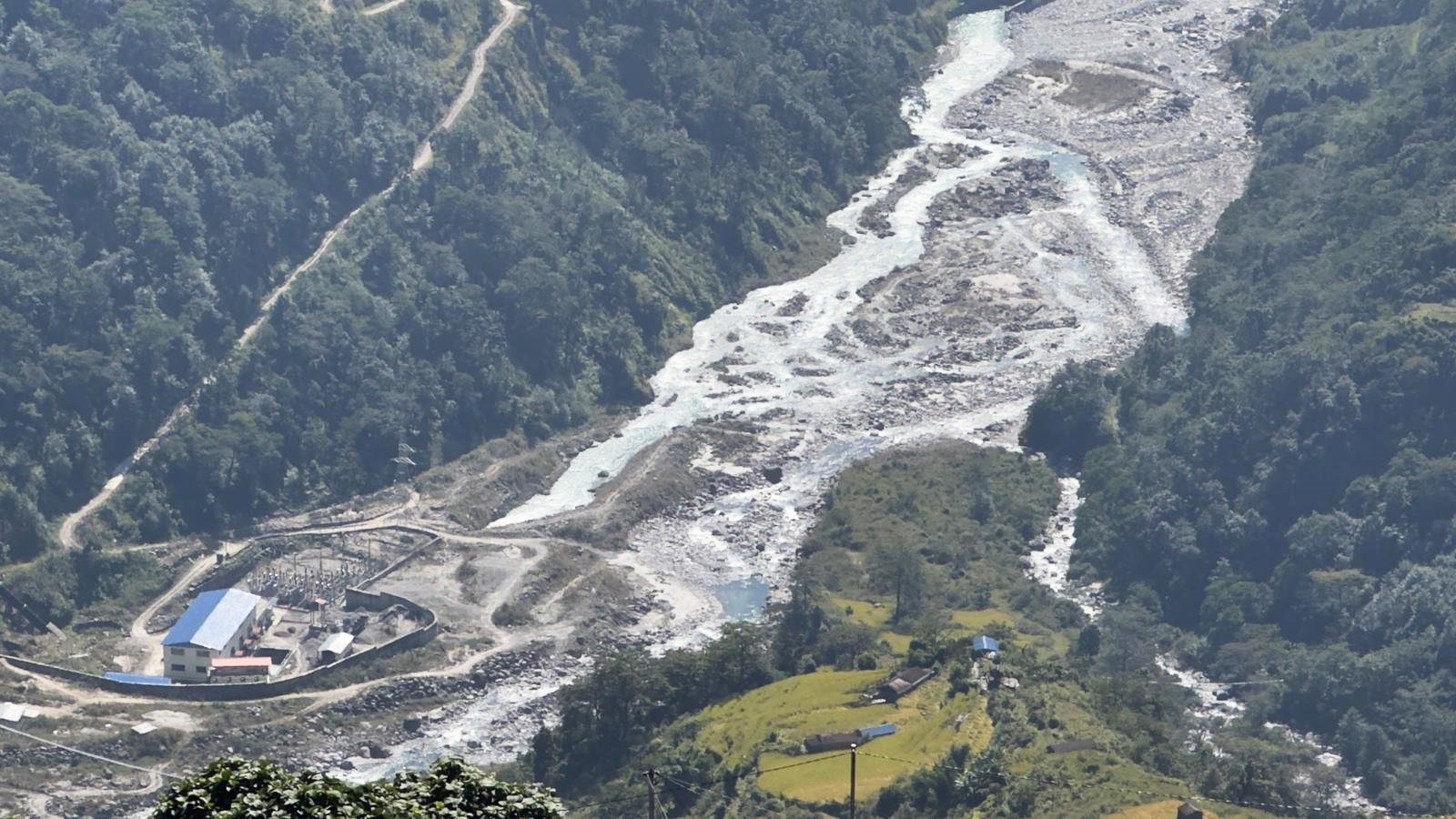 माथिल्लो मादी जलविद्युत् आयोजना र तलतिर सुकेको मादी। तस्वीर: एक्याप