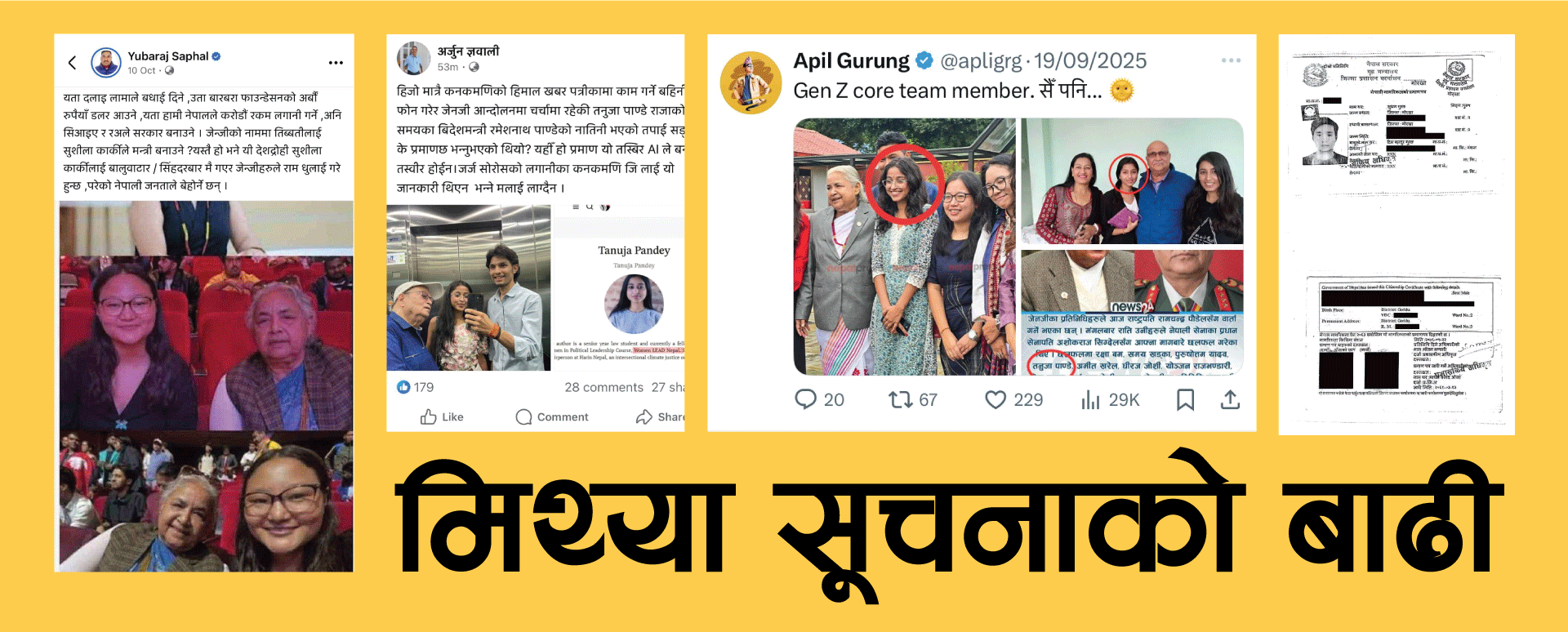 त्यस्तै‚ अपिल गुरुङ नामको ट्वीटर (एक्स) मा पनि भ्रामक सूचना फैलाइएको छ। केपी ओली, सुशीला कार्की र केही विदेशीसँग तनुजाले खिचेका तस्वीरका साथै केही व्यक्तिका पोष्टहरू राखेर अपिलले पाण्डेबारे भ्रम फैलाएका छन्। त्यसमा तनुजालाई नेपालमा सक्रिय ‘सेन्ट्रल इन्टिलिजेन्स एजेन्सी’ (सिआईए) द्वारा सञ्चालित ‘न्याशनल इन्डोमेन्ट फर डेमोक्रेसी’को अगुवा भनी प्रचार गरिएको छ। यति मात्रै होइन, तनुजालाई एमाले निकट रहेको पनि आरोप लगाइएको छ। राजतन्त्र समर्थकका रूपमा चिनिएका पोखरा निवासी अपिलको टिप्पणीलाई तनुजाले खण्डन गरेकी छन्। उनले केपी ओलीसँगको आफ्नो उक्त फोटोबारे असोज पहिलो साता हिमालखबर सँग भनिन्, ‘म कक्षा-१० मा हुँदा केपी ओलीसँग फोटो खिचेको हुँ। संविधान आइसकेपछिको फोटो हो, त्यो। त्यतिखेर सबैले फोटो खिचे, मैले पनि खिचें। तर, यसलाई लिएर मेरो नाम अहिले एमालेसँग जोडेर भ्रामक कुरा फैलाइरहेका छन्।’