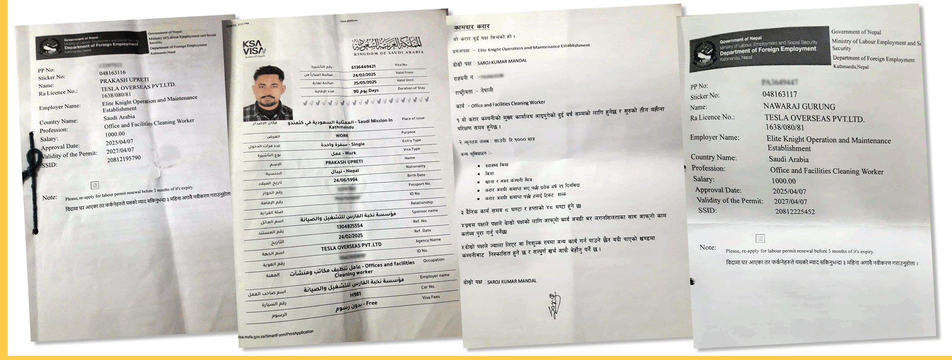 हिमालखबर लाई प्राप्त कागजात अनुसार, कम्पनीले कामदारसँग गरेको सम्झौता पत्रमा कार्यालय र सरसफाइको काम दैनिक ८ घण्टा‚ हप्ताको छ दिन गरी ४८ घण्टा गर्नुपर्ने भनिएको छ, जसबापत मासिक न्यूनतम तलब १ हजार रियालका साथै स्वास्थ्य बिमा लगायत अन्य बिमा, खान र बस्ने सुविधा छ। करार अवधि दुई वर्षको राखिएको छ। करार अवधि समाप्त भएपछि हवाई टिकट निःशुल्क दिइने भनिएको छ। त्यसको आधारमा वैदेशिक रोजगार विभागले सन् २०२५ अप्रिल ७ मा स्वीकृति दिएको देखिन्छ, जसको अन्तिम मिति सन् २०२७ अक्टोबर ३ तारिखसम्म छ।