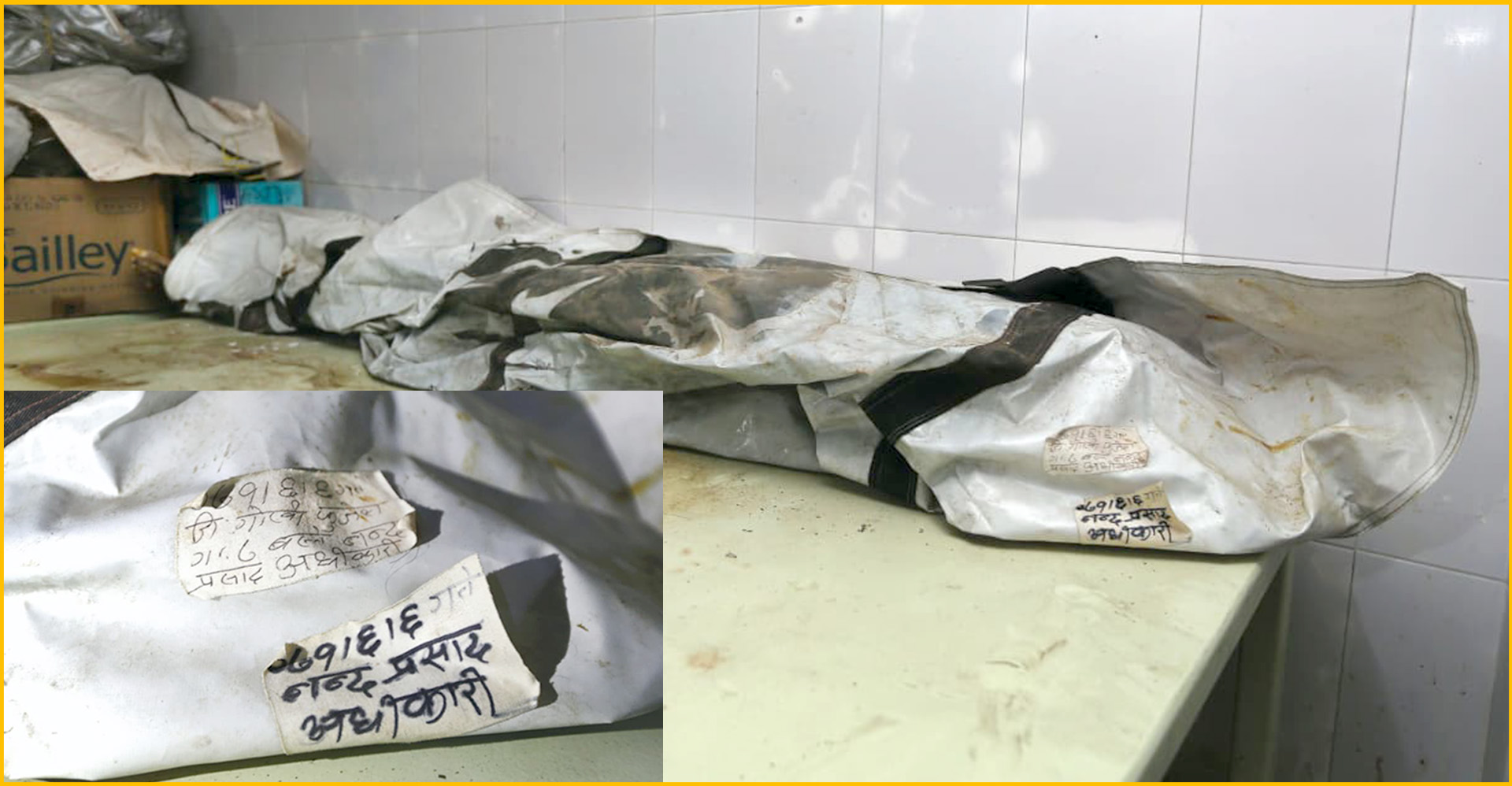 असोज ६ गते नन्दप्रसादको ज्यान गयो। देहावसान हुन नपाउँदै उनको शव प्रहरीले बोकेर गयो। अधिकारकर्मी सुबोधराज प्याकुरेल र म विभिन्न अस्पतालको शवगृह चहाऱ्यौं र अन्त्यमा नन्दप्रसादको शवलाई फेला पाऱ्यौं, शिक्षण अस्पतालको मोर्गको बक्सा नं. ४ मा। त्यसपछि शुरू हुन्छ, नन्दप्रसादको शवको मार्मिक यात्रा र आजसम्मको अवस्था। केही वर्षपछि शव बक्सा नं. ४ बाट गायब भयो। पत्रकार जेबी पुन मगरले शिक्षक मासिकको सह–प्रकाशन नीति विमर्श का लागि अनुसन्धान गर्दा शिक्षण अस्पतालको शव कक्षभित्र मार्करले नाम लेखिएको प्लास्टिक बोरा ‘सुक्खा मोर्ग’ मा फेला पऱ्यो। २०७६ चैत १ गते प्रकाशित पुनको ‘लङ्फर्म स्टोरी’ मा मन दुख्ने तस्वीर छापियो। एउटा ‘बडी ब्याग’ छ, जसमा टाँसिएको स्टिकरमा लेखिएको छ, ‘२०७१–६–६ गते, जिल्ला गोरखा, फुजेल गाउँ- ७ बस्ने नन्दप्रसाद अधिकारी।’
