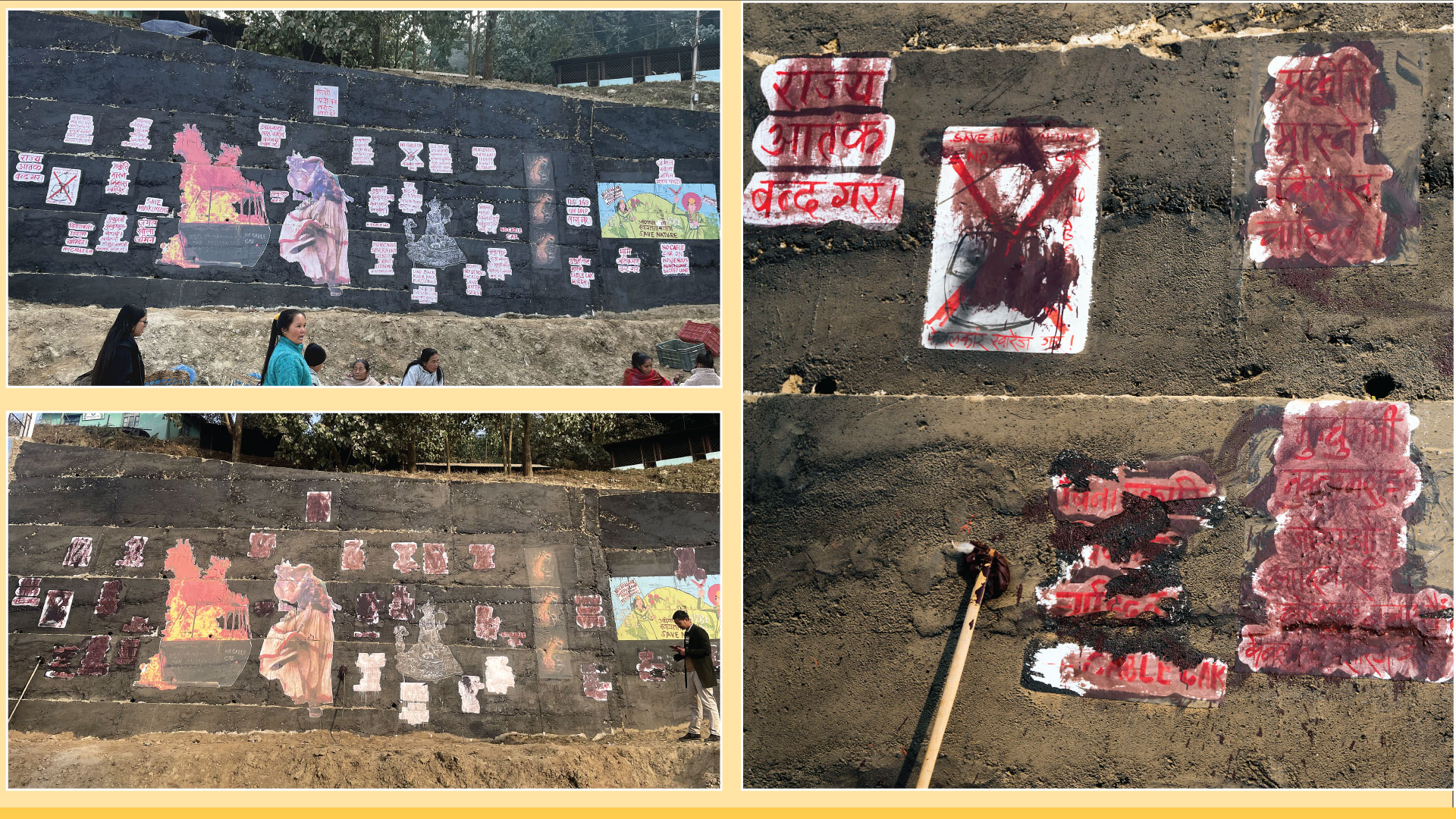 आन्दोलनमा भएको दमन, मागहरू र मुन्धुमी महत्त्व बुझाउने भित्ते लेखन। यो आर्ट कलाकारहरू– सुवास थेवे, सुवास तामाङ, मेख लिम्बू, सारा कोंइच सुनुवार, सुवोध सिम्बू, किरण सिगू र सोनाम चाम्लिङले गरेका थिए। तस्वीर : सीता मादेम्बा