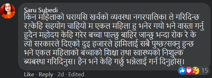 “महिलाको घरायसी खर्चको व्यवस्थापन नगरपालिकाले गरिदिन्छ र?" एउटा पोस्ट यस्तो थियो, “म एकल महिला हुँ भनेर गयो भने वास्ता गर्नुहुन्न। आफैं विदेश गएर बच्चा पाल्छु भन्दा रोक्नुहुन्छ। सक्नुहुन्छ भने एकल आमाका सन्तानको शिक्षा र स्वास्थ्य सेवा नि:शुल्क गरिदिनुस्। हैन भने केही गर्छु भन्नेलाई गर्न दिनुहोस्।"