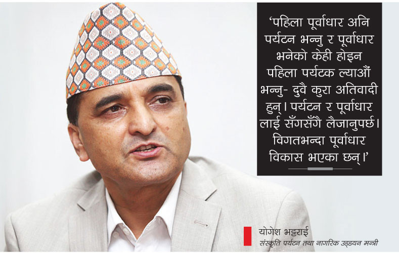 ‘पहिला पूर्वाधार अनि पर्यटन भन्नु र पूर्वाधार भनेको केही होइन पहिला पर्यटक ल्याऔं भन्नु– दुवै कुरा अतिवादी हुन्। पर्यटन र पूर्वाधारलाई सँगसँगै लैजानुपर्छ। विगतभन्दा पूर्वाधार विकास भएका छन्।’