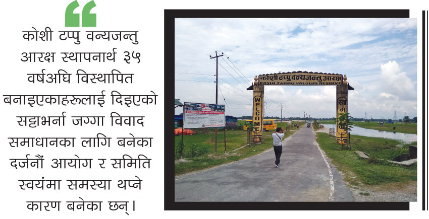 कोशी टप्पु वन्यजन्तु आरक्ष स्थापनार्थ ३५ वर्षअघि विस्थापित बनाइएकाहरूलाई दिइएको सट्टाभर्ना जग्गा विवाद समाधानका लागि बनेका दर्जनौं आयोग र समिति स्वयंमा समस्या थप्ने कारण बनेका छन्।
