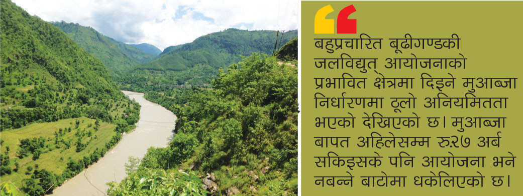 निर्माण तय नहुँदै बहुचर्चित बूढीगण्डकी जलविद्युत् आयोजना प्रभावित क्षेत्रको मुआब्जा निर्धारण अनियमितताको विवादमा तानिएको छ । धादिङ र गोरखामा पर्ने आयोजना प्रभावित क्षेत्रमा पर्ने बजार इलाकाका उस्तै स्थानको मुआब्जा निर्धारण गर्दा फरक–फरक मूल्य तय गरेर राज्यकोषलाई नोक्सान पुर्याएको उजुरी परेपछि अख्तियार दुरुपयोग अनुसन्धान आयोगले अनुसन्धान अगाडि बढाएको छ ।
