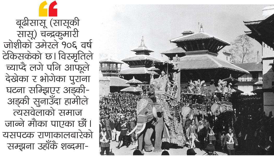 मेरी मितिनीलाई पनि लग्यो, जुद्धशमशेरले । म त्यति वेला विधवा भएर पोकलड्याङमै थिएँ, फुपूको घरमा । मेरी मितिनीको घर नजिकै थियो । उनको बिहे भइसके पनि तरुनी थिई । जुद्धशमशेर हात्तीमा आयो र ‘ऊ त्यो घरको त्यो केटीलाई ल्या’ भन्यो । अनि राति त डाक्न आए । मेरी मितिनीलाई थाहै थिएन । उनको आमाबाबुलाई ‘सरकारले हुकुम भएको छ, छोरीलाई लानुपर्यो’ भनेछन् ।