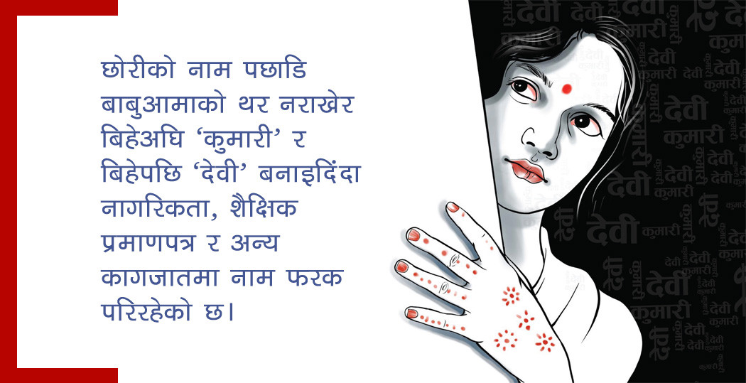 छोरीको नाम पछाडि बाबुआमाको थर नराखेर बिहेअघि ‘कुमारी’ र बिहेपछि ‘देवी’ बनाइदिंदा नागरिकता, शैक्षिक प्रमाणपत्र र अन्य कागजातमा नाम फरक परिरहेको छ।