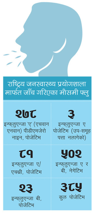 राष्ट्रिय जनस्वास्थ्य प्रयोगशालाका अनुसार सन् २०१९ को डिसेम्बरमा ५ जना नेपालीमा भेटिएको मौसमी फ्लु २०२० मार्च ८ सम्ममा ३८५ जनामा देखियो (हे.इन्फो) । सन् २०२० को पहिलो दुई महीनामा परीक्षण गराएकामध्ये ४६ प्रतिशतमा मौसमी फ्लु पोजेटिभ देखिएको छ । जबकि सन् २०१९ मा परीक्षण गराएकामध्ये २५ प्रतिशतमा मात्र संक्रमण भेटिएको थियो ।