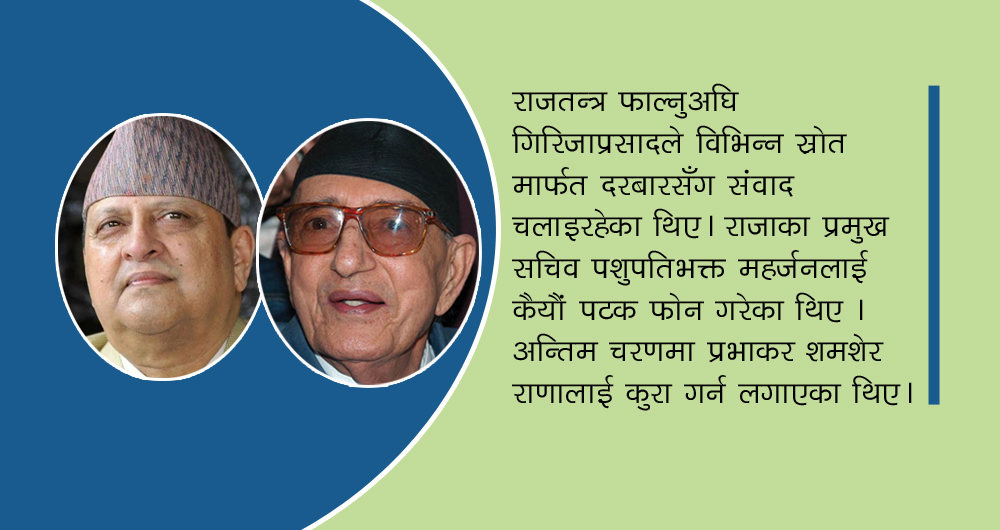 राजतन्त्र फाल्नुअघि प्रधानमन्त्री कोइरालाले विभिन्न स्रोत मार्फत दरबारसँग संवाद गरिरहेका थिए। निरञ्जनले सम्झिए, ‘राजाका प्रमुख सचिव पशुपतिभक्त महर्जनलाई कैयौं पटक फोन गरेको मलाई थाहा छ। म पनि उहाँसँगै थिएँ। अन्तिम चरणमा प्रभाकर शमशेर राणा (सोल्टी होटलका मालिक) लाई कुरा गर्न लगाउनुभयो।’