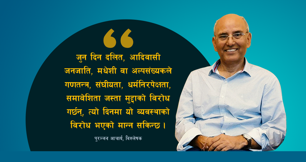 जहाँसम्म संविधानमा व्यवस्था गरिएका गणतन्त्र, संघीयता, धर्मनिरपेक्षता, समावेशिता जस्ता मुद्दा जनताका मुद्दा हुन्। यसको विरोध जनस्तरबाट भएको छैन। जुन दिन दलित, आदिवासी जनजाति, मधेशी वा अल्पसंख्यकले यो मुद्दाको विरोध गर्छन्, त्यो दिनमा यो व्यवस्थाको विरोध भएको मान्न सकिन्छ। मधेश केन्द्रित दलले संघीयता खारेज हुनुपर्छ भनेको सुन्नुभएको छ? छैन नि।