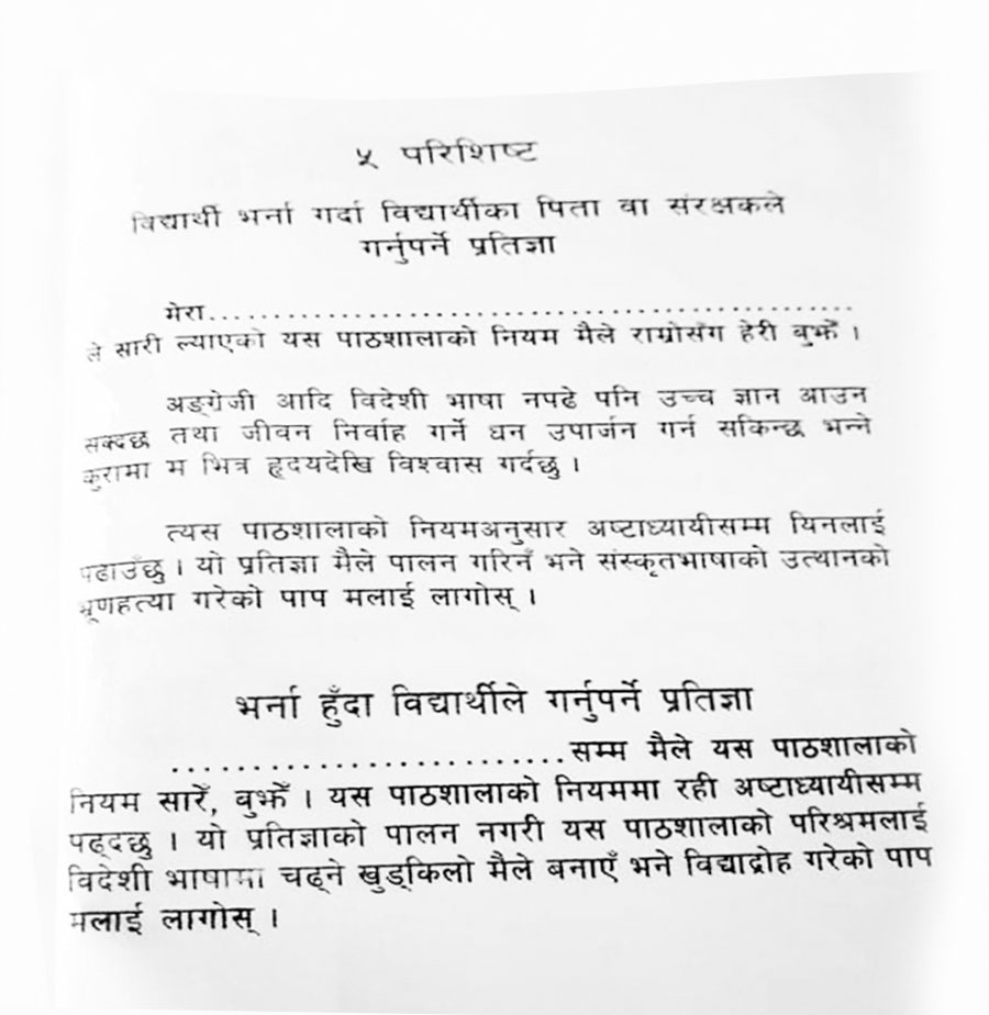 अझ उनको पाठशालामा पढ्ने शिष्यले ‘यस पाठशालाको परिश्रमलाई विदेशी भाषामा चढ्ने खुड्किलो मैले बनाएँ भने विद्याद्रोह गरेको पाप मलाई लागोस्’ भनेर र अभिभावकले ‘अंग्रेजी आदि विदेशी भाषा नपढे पनि उच्च ज्ञान आउन सक्छ तथा जीवन निर्वाह गर्ने धन उपार्जन गर्न सकिन्छ भन्ने कुरामा म भित्र हृदयदेखि विश्वास गर्दछु’ भनी प्रतिज्ञा गर्नुपर्दथ्यो। (हाम्रो उद्देश्य र कार्यप्रणाली, ई. २००२, परिशिष्ट ५, पृ. ७१)