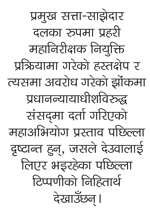 देउवा प्रधानमन्त्री बन्ने चर्चासँगै असन्तुष्टि र निराशाका स्वर सुनिन थालेका छन् । पहिलो कार्यकालभन्दा तुलनात्मक रूपमा परिपक्व र शालीन प्रस्तुति देखाएका दाहालपछि प्रधानमन्त्री बन्ने देउवाको सत्तारोहण नजिकिंदै गर्दा अनिश्चितताको भय पनि देखा पर्दैछ । यसका पछाडि केही तथ्यगत प्रमाण छन् । किनभने तीन तीन पटक प्रधानमन्त्री बनेका देउवा ती पात्र हुन्, जसको कार्यकालमा गर्व गर्न लायक कुनै काम भएनन् ।