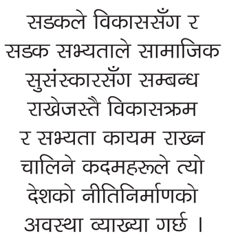 हाम्रा कतिपय जिल्लाका सदरमुकामबाट गाउँमा पुग्न साता दिनसम्म हिंड्नुपर्ने अवस्था छ । विस्तारै सडक पनि बन्दैछ, तर सरकारले सवारी साधनलाई अझै पनि विलासिताको वस्तु मानेर २४० प्रतिशतसम्म कर असुलिरहेको छ । सडकमा पैदल यात्रुको लागि हिंड्ने ‘सुविधा’ हेर्दा, सर्वसाधारणप्रति राज्यको हेपाहा आचरण देखाउँछ भने सडकमा लेन मिचेर गुड्ने गाडी र पैदल यात्रीको व्यवहारले हाम्रो सामाजिक सभ्यताको स्तर । र पनि हामी, बाहिरी चक्रपथतिर उन्मुख छौं । त्यो भनेको हामी क्रमशः सुसंस्कृत नै हुँदैछौं ।